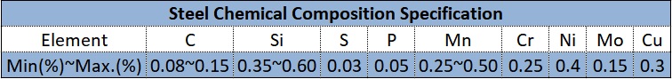 The cast Anode yoke is made from cast steel alloy, normalized and in accord with BS3100 Grade A1. The maximum value for equivalent carbon (CEV), based on the mill test, shall be 0.35 CEV and shall be calculated using the following formula: